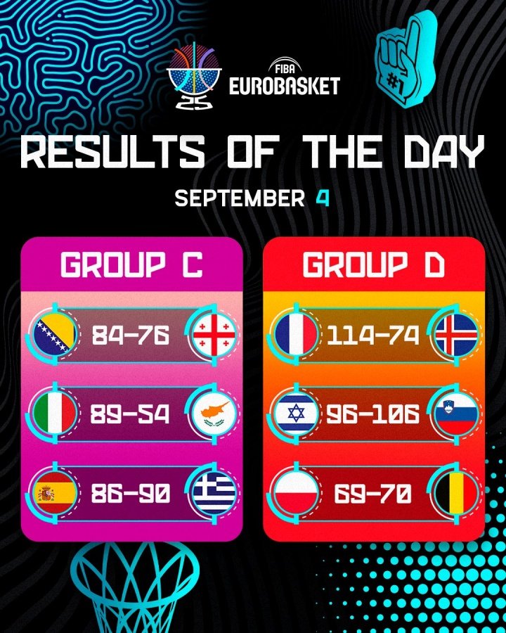 09月05日讯 男篮欧锦赛当地时间9月4日的6场小组赛全部结束,详细赛果如下: