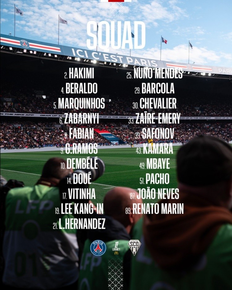 前锋: 9-贡萨洛-拉莫斯、10-登贝莱、14-杜埃、19-李刚仁、29-巴尔科拉、49-姆巴耶