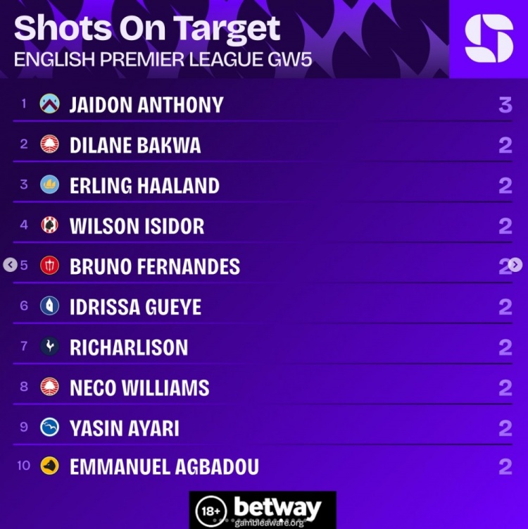 9月24日讯 英超第5轮战罢,squawkafootball列各项数据排行,伯恩利前锋杰顿-安东尼是射正次数最多的球员,共3次。