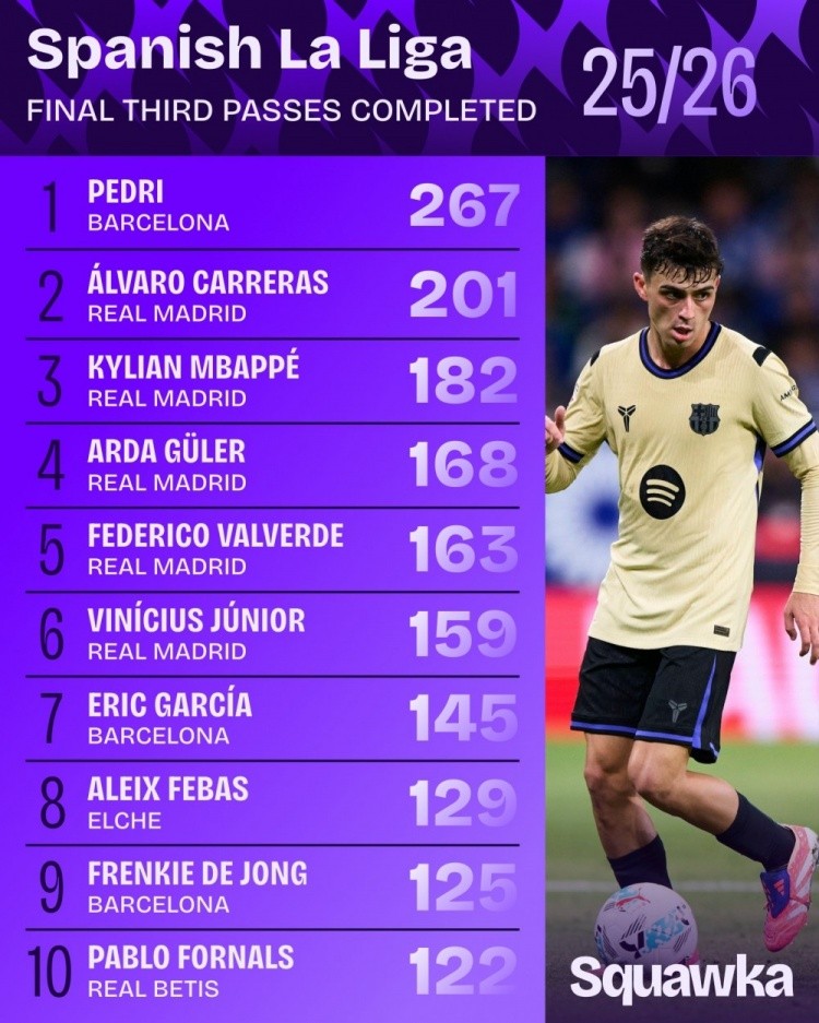 10月7日讯 日前,Squawka统计了本赛季西甲进攻三区传球次数排行,佩德里267次居首,5名皇马球员进前十。
